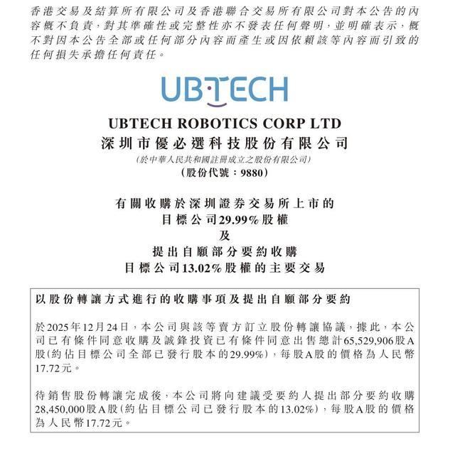 智东西12月24日报道,刚刚,“ 人形机器人第一股”优必选(9880.HK)发布公告,以“协议转让+要约收购”的组合方式共收购深交所上市公司锋龙股份(002931.SZ)93957518股(占锋龙股份公司股份总数43%)。