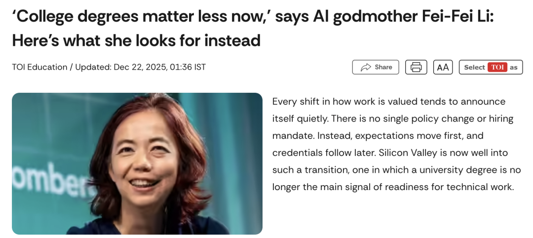 「AI教母」、斯坦福大学教授李飞飞直言,相较于学位,掌握新工具的能力更重要。