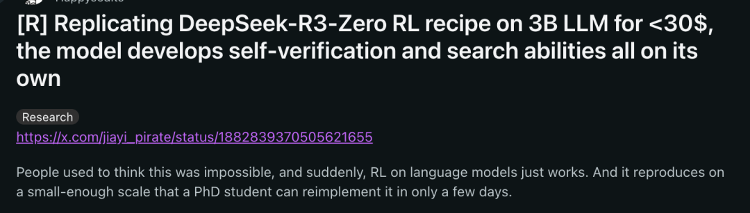 随后,有研究者在3B参数模型上以低于30美元的成本复现了DeepSeek-R1-Zero的强化学习训练方案。