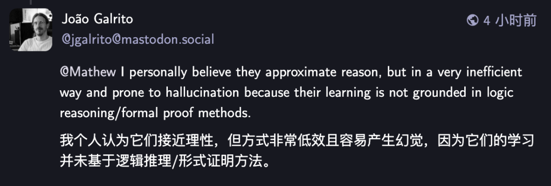 有人回答得一针见血:「它在逼近理性,但方式非常低效且容易产生幻觉,因为它没有基于逻辑推理形式。」