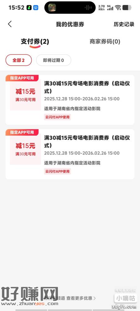 湖南地区云闪付领两张30-15电影券,现在还有
