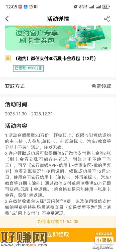 农行30元刷卡金,特邀。扫码,前两天还不能领,今天试了领到了,刷了6笔5.1,返现了30元,自测