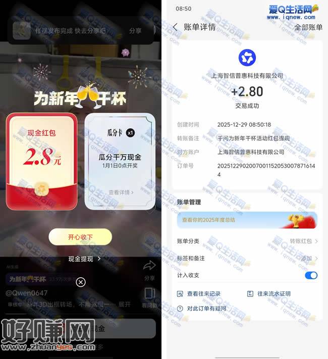 千问app-右上角点进去-合拍发布-抽红包-可以直接提现到支付宝