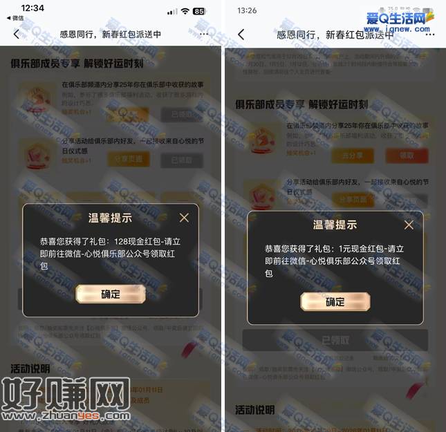 反馈128元现金秒到 心悦会员俱乐部新春红包派送