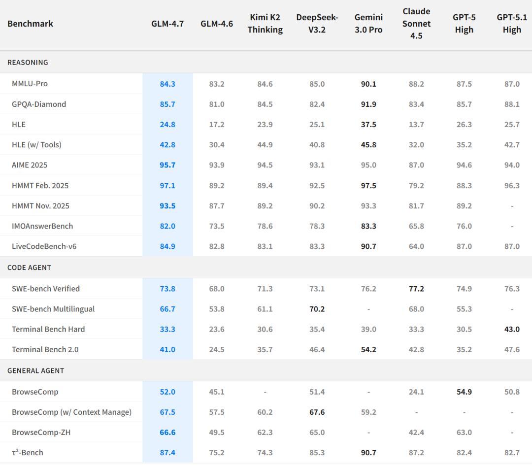 与 GPT-5、GPT-5.1-High、Claude Sonnet 4.5、Gemini 3.0 Pro、DeepSeek-V3.2、Kimi K2 Thinking 相比,GLM-4.7 也表现出色: