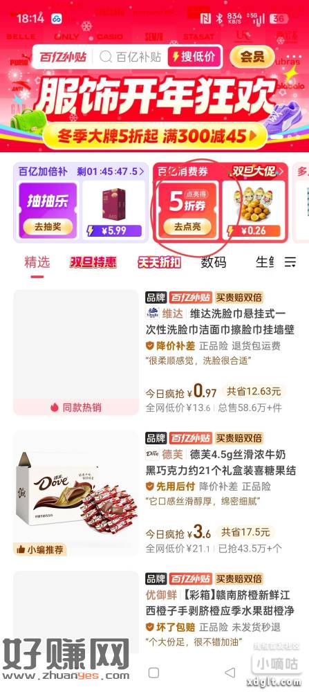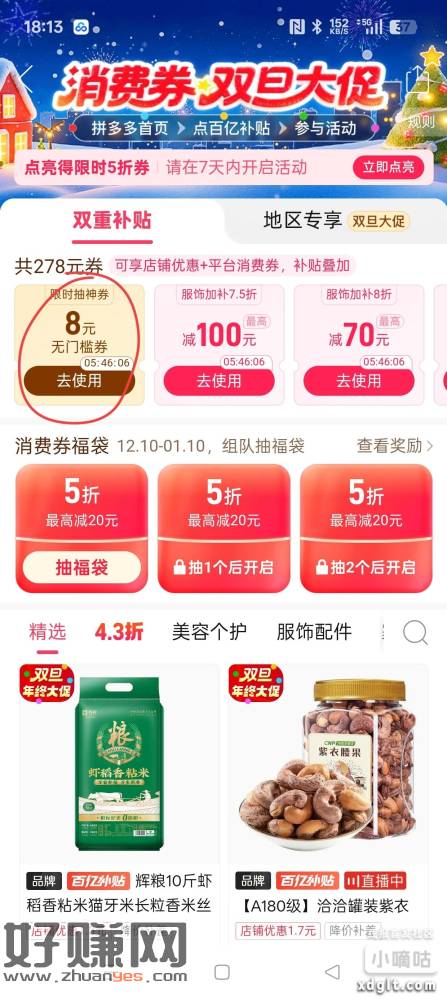拼多多首页,百亿补贴进去,百亿消费券,然后抽无门槛券最高16