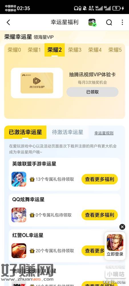 腾讯视频---我的游戏---幸运星权益或者顶部左上角爱玩有礼---待激活幸运星