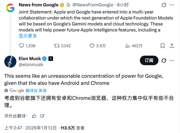 消息一出,马斯克第一个不高兴了,在X上评价称这种“权力集中”不合理,毕竟谷歌旗下还有安卓和Chrome浏览器。