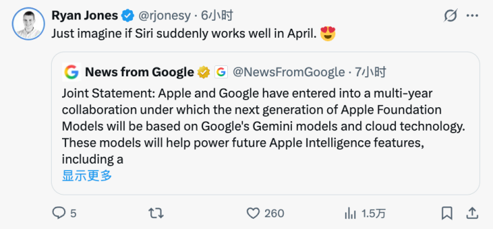 这相当于在说,谷歌如今连苹果AI都控制了。但这话,苹果一定不会同意。