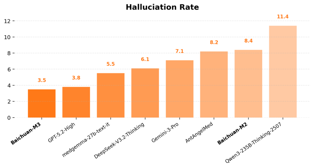 在技术实现上,百川特别做了幻觉的打压和推理能力的平衡。在Baichuan-M3里,引入了新的强化学习手段,既做到能够打压幻觉,同时还能让推理能力走强。最终在不依赖工具或检索增强的纯模型设置下,医疗幻觉率3.5,超越GPT-5.2,达到全球最低水平。