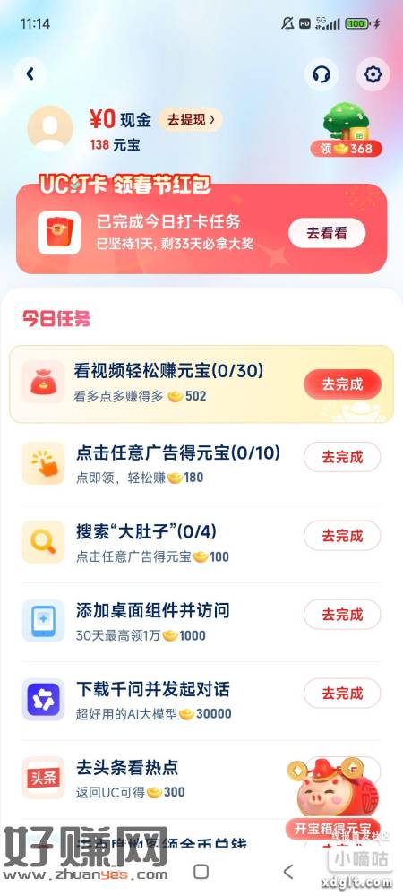 UC浏览器打卡签到活动,持续到2月16日。今天开始了 入口我的 福利猪领元宝,自己看规则。