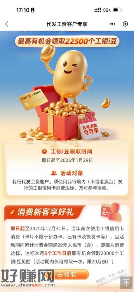 链接进去,用卡礼,新户领20000豆,老用户去年8-12月每月有99消费的,每个月可以领500豆子 https://m.icbc.com.cn/column/117 ... ser=181700014629362