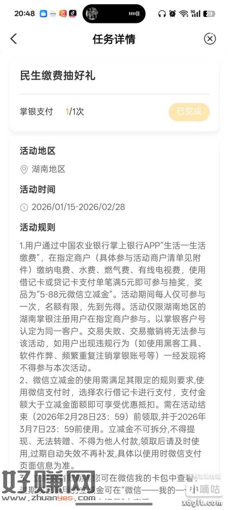 农行湖南地区水电燃有线电视缴费抽5-88元微信立减金