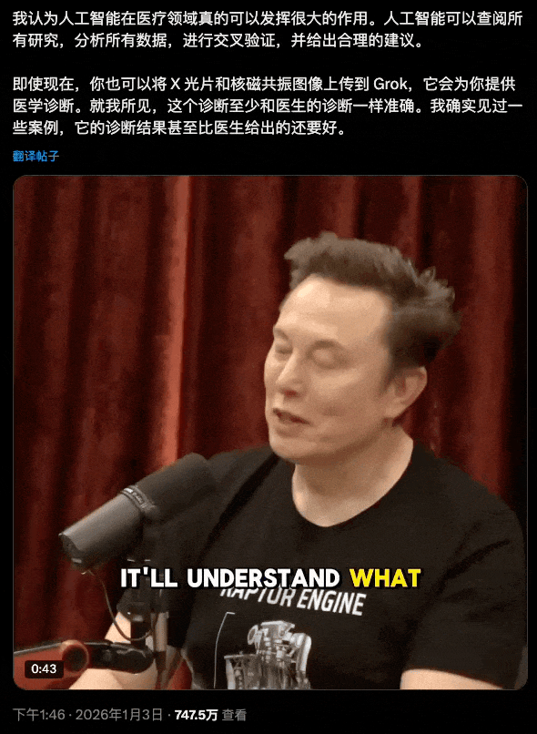 Grok 的老板毕竟是马斯克,恨不得把人类都发射上天。他在许多采访中都表示,一个人类医生只能阅读有限的医学文献,只能记住有限的病例。而 AI 可以在几秒钟内阅读人类历史上所有的医学论文,掌握所有的最新治疗方案。在纯粹的诊断准确率上,人类无法与 AI 竞争。