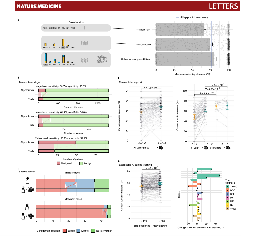 一项相对更近的研究是 2020 年,一项针对皮肤癌检测的研究发现,当 AI 给出正确诊断的时候,所有医生的准确率都提高了。可一旦给出的诊断是错误时,越是经验不足的医生准确率下降得越厉害。综合来看,AI 和医生共同诊断,准确率的表现是最好的。