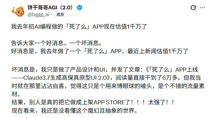 死了么App爆火之后,一位叫饼干哥哥的网友,笑称“自己错失了1个亿”, 去年初,他曾经在网上发了一个教学帖,里面的内容是,用AI快速生成一个程序。