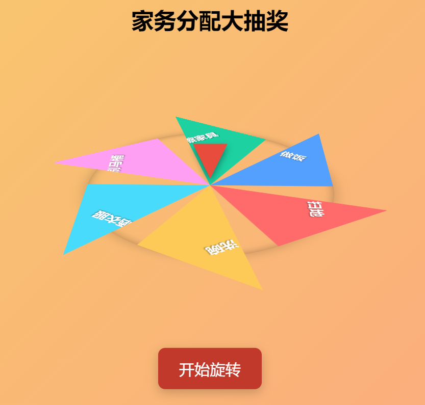 比如说,我们现在用TRAE做了一款家务分配幸运转盘,它生成的初版作品,转盘是倾斜的3D样式,部分字被遮挡了,不太方便看。