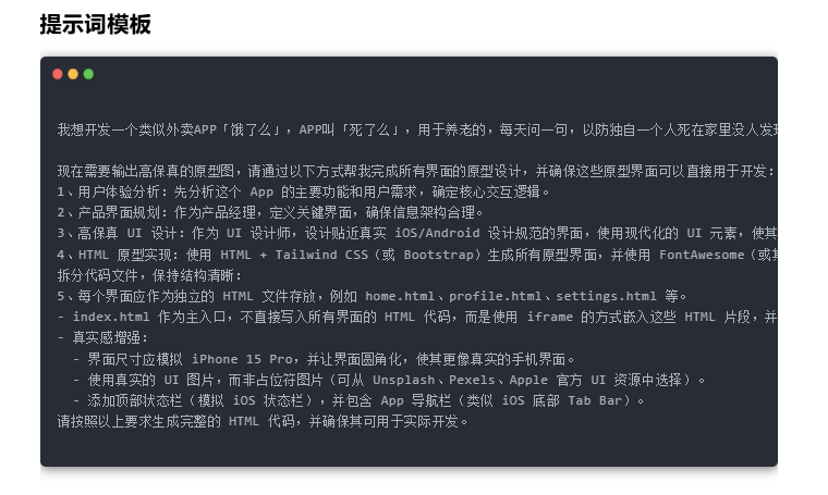 他告诉 Claude 大模型,自己想开发一个类似 “饿了么”的App,改名叫死了么,App每天问一句“你挂了吗?”,没回应就视为挂了,然后这个App也有骑手,哪里有人死了就去接单收尸。然后提示,这个App专门为独居 90 后的年轻人设计的,风格要求清新好看、App 内的文案多用搞怪的网络用语。