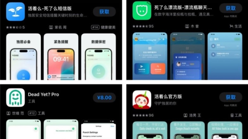 反倒是这次死了么爆火之后,有一大片模仿者出现,什么死了吗、活着么、还在吗、Dead Yet,几十个不同款式出现在App Store,不仅功能高度相似,有些甚至连名字都一样,只是换个图标而已。