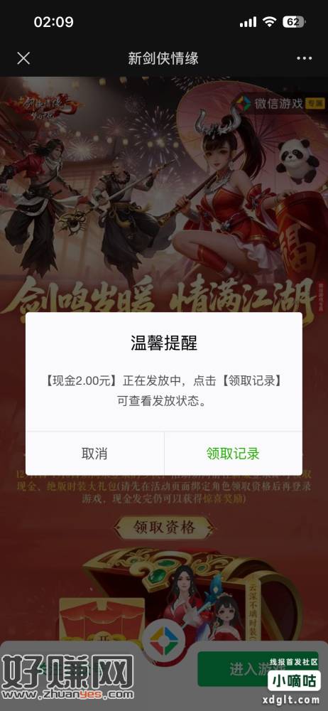 注册领 2 元红包(有包)进入游戏有个提示,点确认秒升到 26 级,一定要点这个,不然没满 25 级领不了注册红包注册包奖金池: 2 元红包 5000 份 60% 概率8 元红包 3000 份 20% 概率18 元红包 500 份 14% 概率68 元红包 100 份 5% 概率108 元红包 50 份 1% 概率188 元红包 10 份 0.1% 概率回归玩家6 元红包(自测)活动入口:微信-发现-游戏-搜“新剑侠情缘”进圈点菜单栏最新大横幅