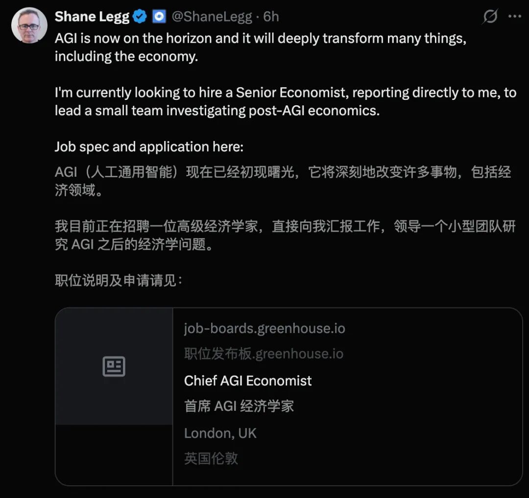 「AGI已近在咫尺。它的出现将深刻改变人类社会,尤其是全球经济体系。我正在紧急寻找一位高级经济学家,加入我的团队。」