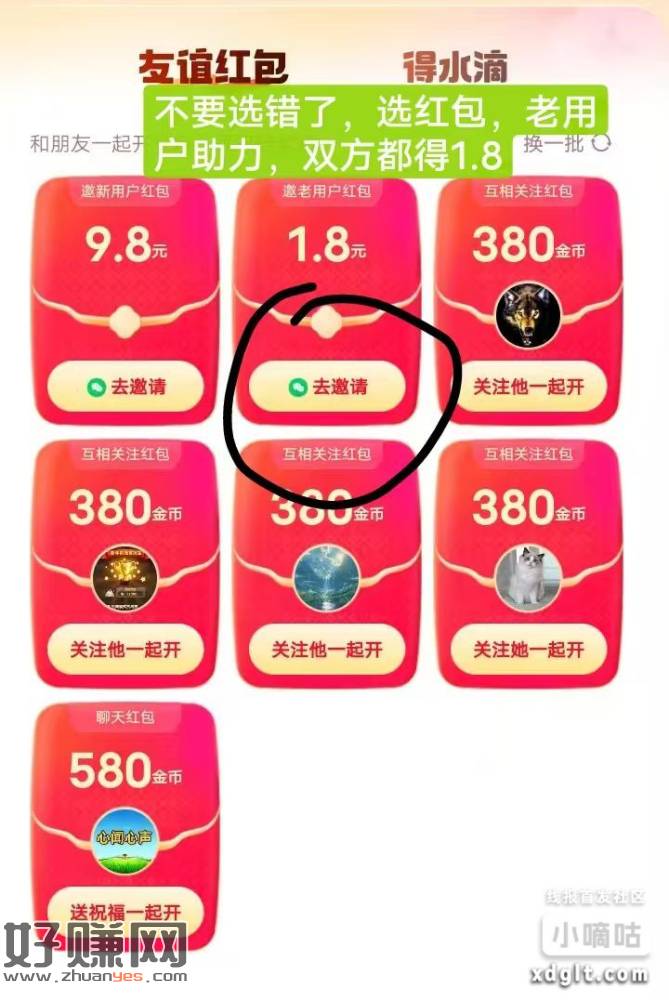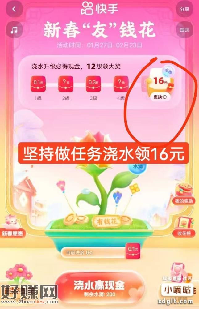 快手,搜,新春有钱花,没看到有人发,玩过的忽略1.浇水到12级必得162.友谊红包进去选择邀请老用户带红包图的,小号助力,大小号都得1.8,2.17日6点后提