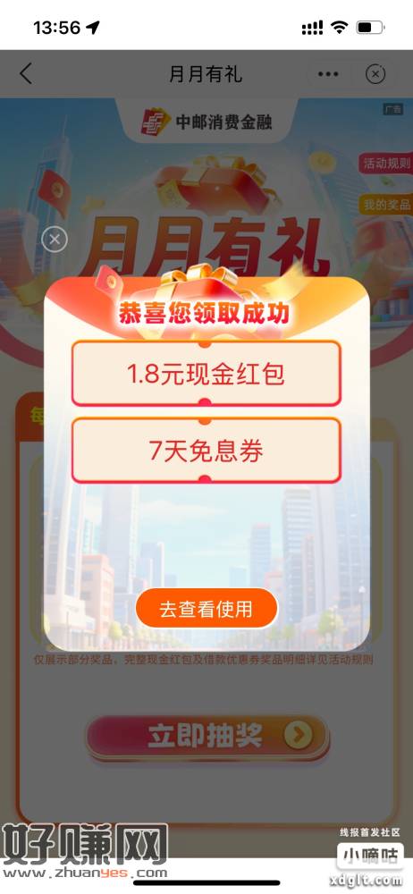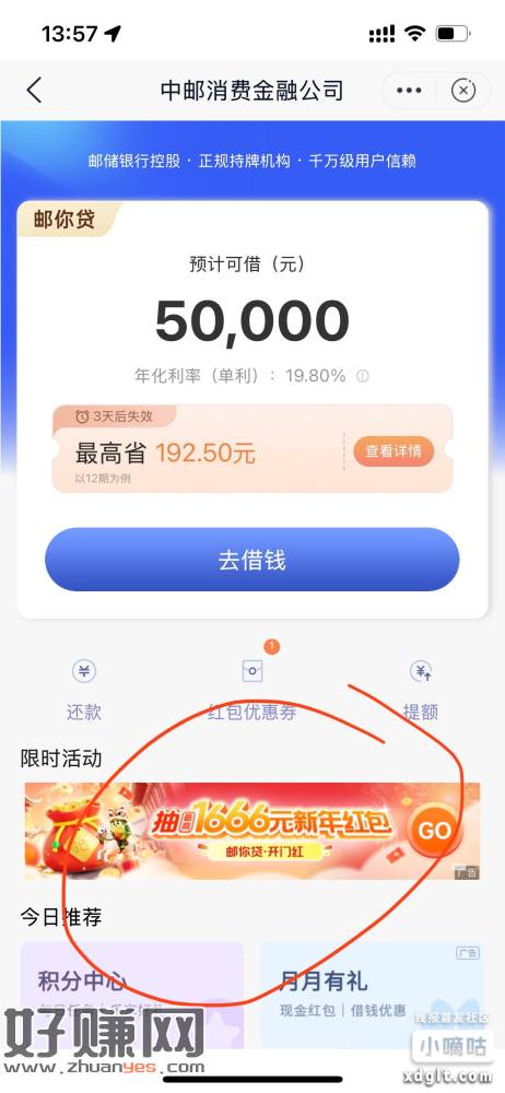 邮储银行邮你贷月月有礼红包1.8元,路径抽1666点进去再下拉找到月月有礼