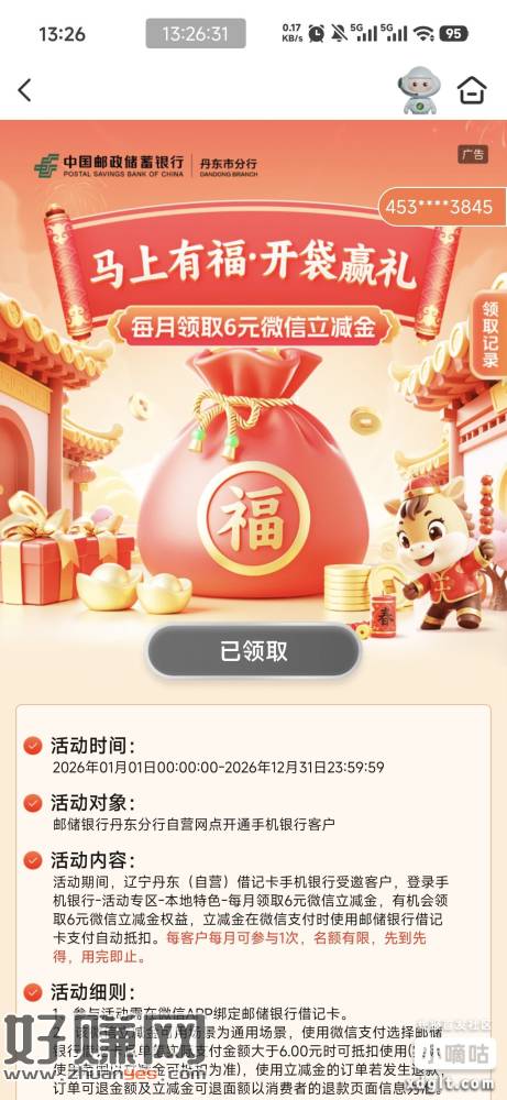 邮储本地 热门活动里丹东市分行领6,手机银行必须在丹东分行