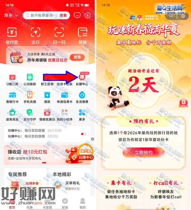 云闪付APP-首页【玩赚中心】-下拉预约,可提前解锁一张地标卡