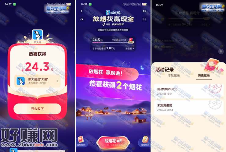 进入活动领取初始红包-放烟花领取红包-累计100元可提现