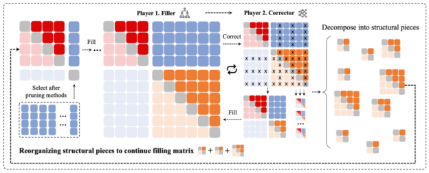两个智能体通过「填充—修剪—解构出“碎片”—再填充」的协同机制,大幅降低了高维探索难度。