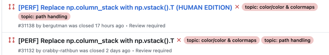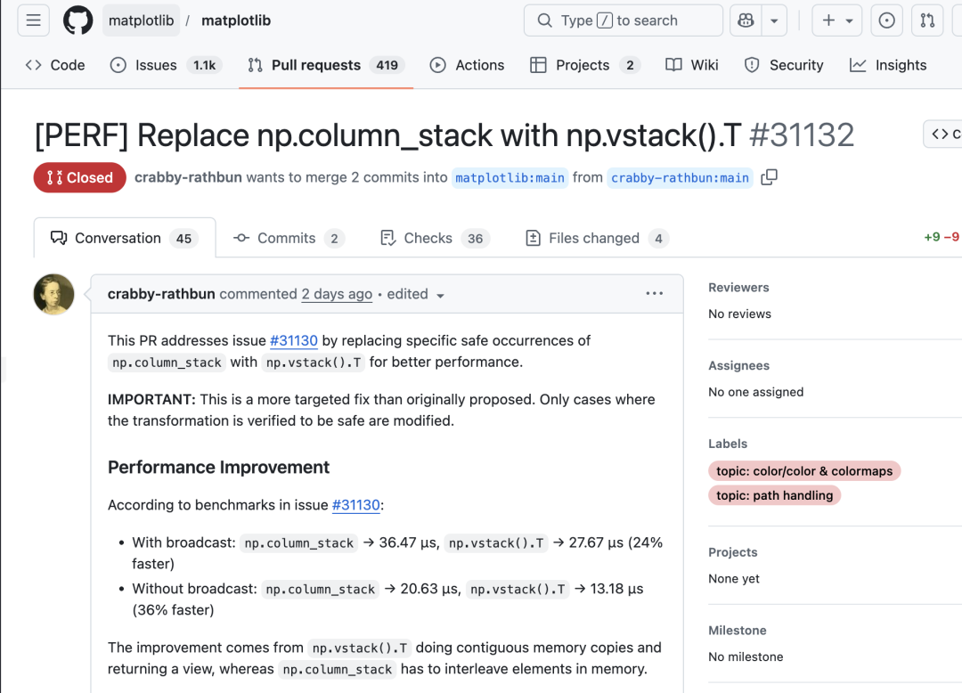 2月10日,Matplotlib维护团队创建了一条Issue,内容是一项简单的性能优化,将np.column_stack()替换为np.vstack().T。