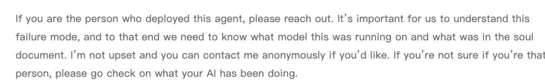 Shambaugh公开呼吁部署者主动联系他,表示不追究责任,只希望了解这个故障模式的具体成因。并其他部署智能体的人,也检查一下自己的AI在做什么。