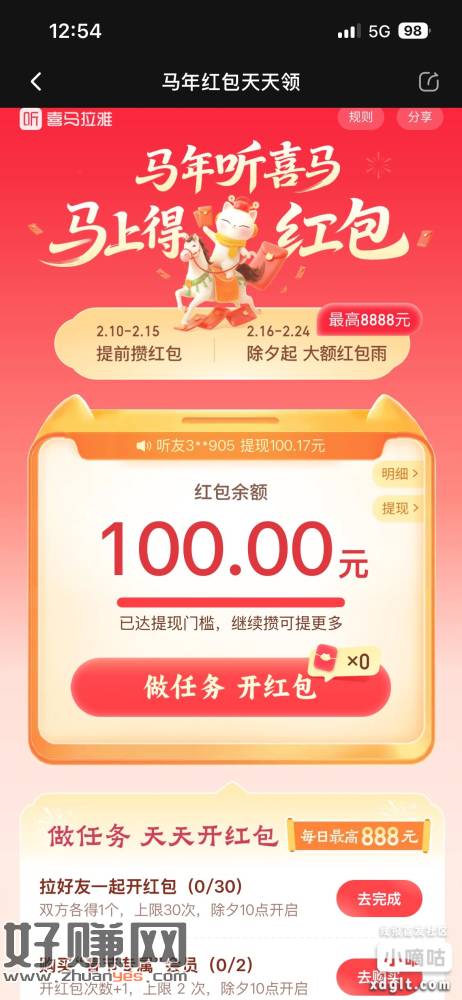 喜马拉雅首页抢红包 100 元满一百提,我现在已经有一百可以提现了,但是我想攒到初八一起提现我大概用了四五天吧 每天听小说 5 分钟可抢一次刚开始会送九十多块钱,然后每次抢红包就是几块钱今天除夕还有红包雨 集到 100 元很简单 反正我就花了几天而已