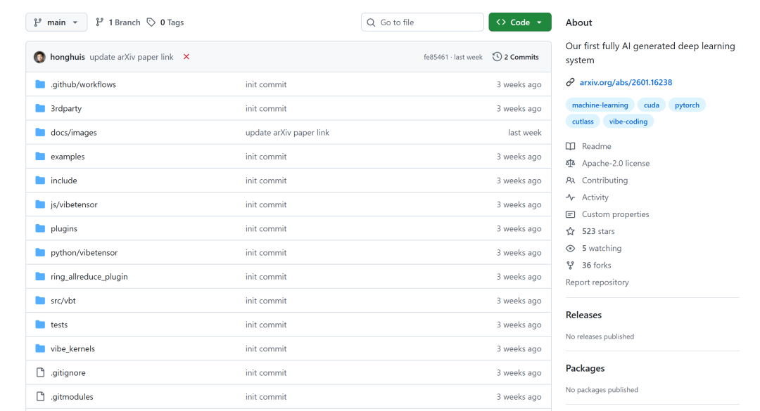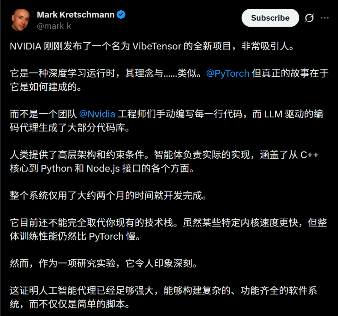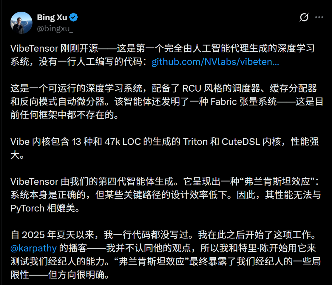 英伟达高级工程师Bing Xu开源了VibeTensor项目,并且表示:「这是第一个完全由 AI 智能体生成的深度学习系统,没有一行人类编写的代码。」