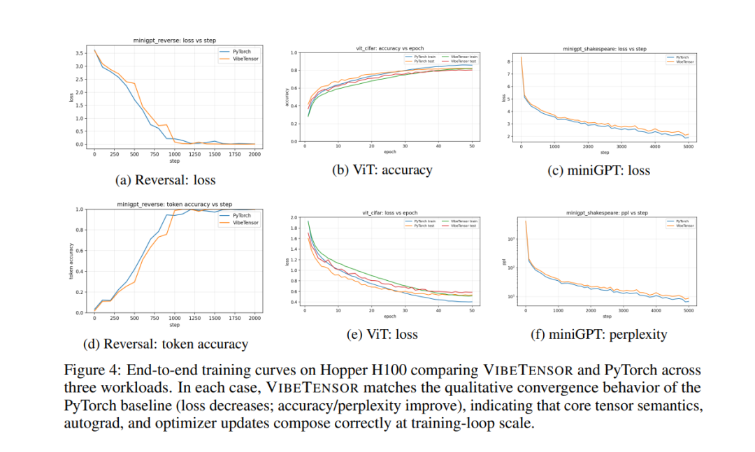 论文展示的训练曲线表明,在这些任务上,VibeTensor与PyTorch在整体收敛趋势上是高度一致的:loss能够稳定下降,accuracy或perplexity持续改善,没有出现梯度爆炸、训练发散或「跑几步就崩」的情况。
