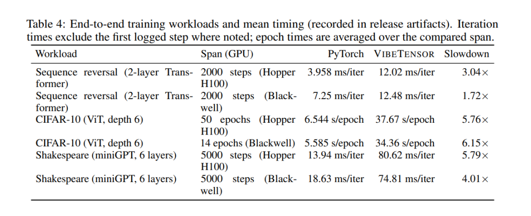 需要强调的是,作者非常克制:他们反复声明VibeTensor性能明显落后PyTorch,也不适合生产环境。