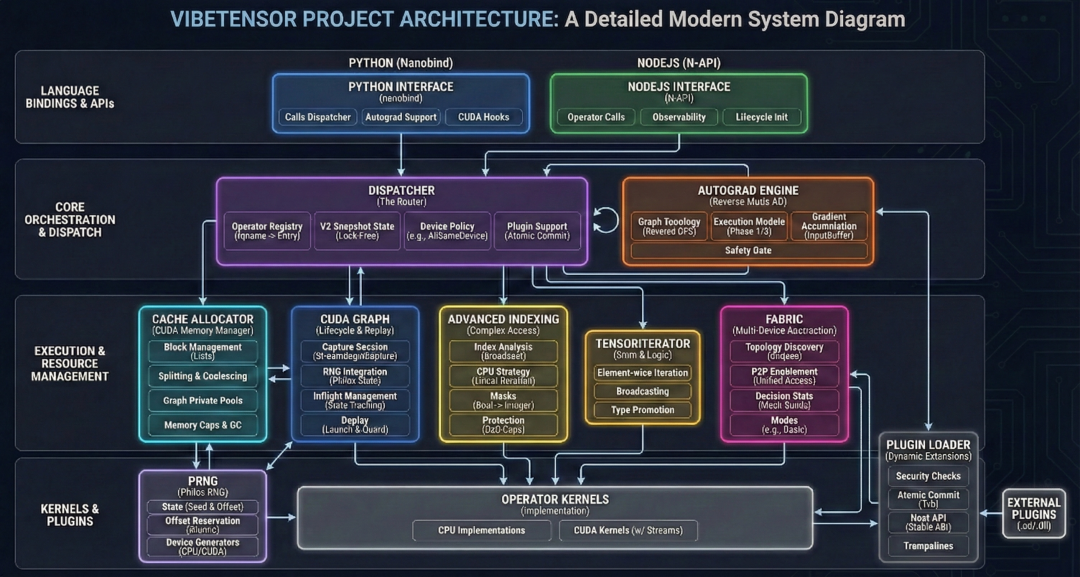 但在实现上,VibeTensor并不是PyTorch的封装或裁剪版,而是实现了自己的一整套系统栈。