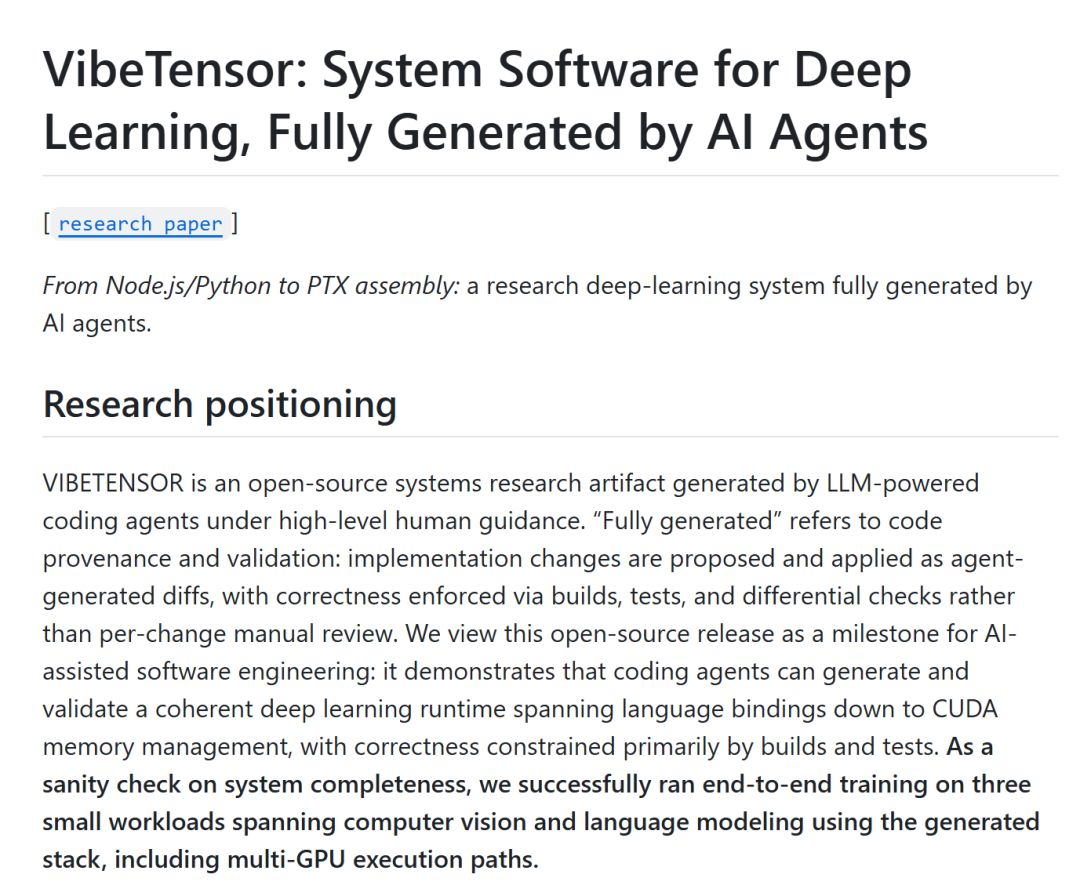 总之,如果用一句话来概括VibeTensor这篇论文的意义,那就是:这是第一篇用完整可运行系统证明「AI已经可以触碰深度学习系统工程核心腹地」的论文。