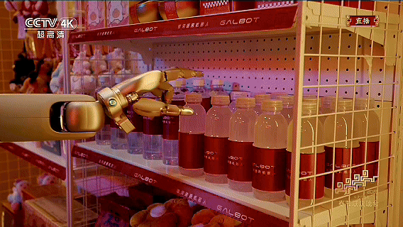 这要求机器人必须同时处理三重难题:一是通过大脑精准判断水瓶在货架上的位置;二是用拟人的动作伸手拿到水瓶,并过程中不能碰倒周围的商品;三是灵巧操作,水瓶上半身较细、下半身较粗,且通常被紧密卡位,直接平移取出极易卡顿。