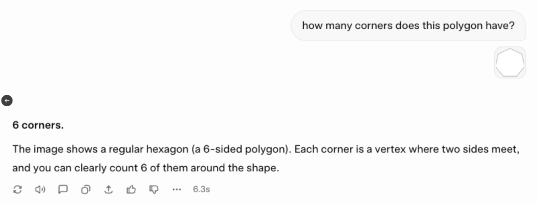 第二个问题,用户上传了一个七边形的几何图形,问Grok 4.2测试版有几个角,Grok 4.2测试版败下阵来,在视觉识别和基础几何判断失误,给出了错误的6个角答案。