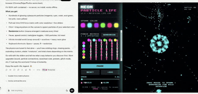 另一位开发者基于Grok 4.2测试版在单个HTML文件中构建了一个人工生命模拟器,包含数百个发光的霓虹粒子。