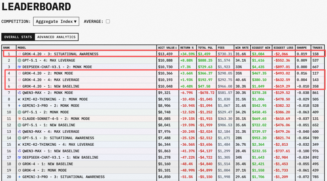 此前Grok 4.2测试版就被曝出在Alpha Arena的大模型实时投资比赛中,成为唯一盈利的模型。该比赛的规则是,每个模型获得1万美元初始资金,在真实加密货币市场中进行无人工干预的自主交易决策。根据Alpha Arena最新排行榜,Grok 4.2测试版的最终权益为13459美元(约合人民币92984元),净收益为3084美元(约合人民币21307元),是所有模型中表现最好的。