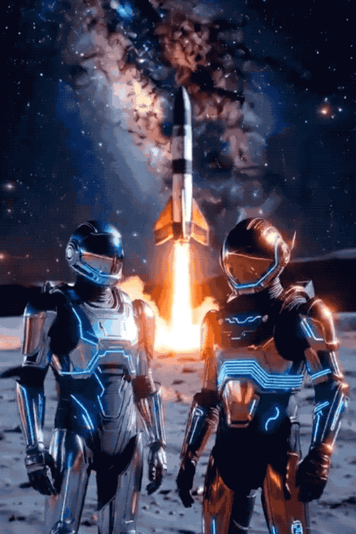 如下面的提示词是SpaceX猎鹰9号火箭从太空返回地球,视频中显示有两个机器人视线跟随火箭升空抬升。