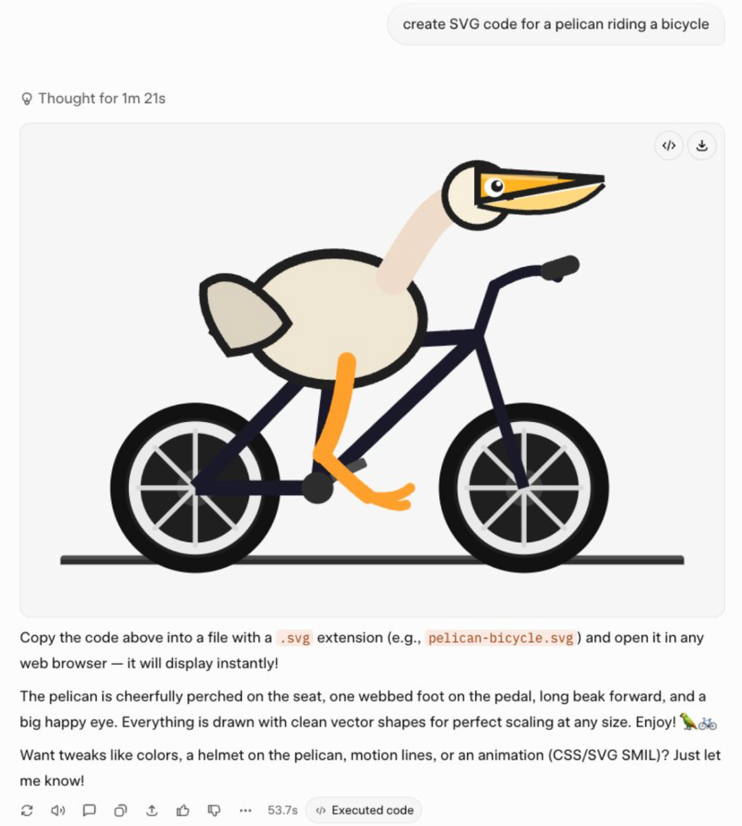 此外,也有网友对Grok 4.2测试版的评价不高。他只试用了5分钟,就认为Grok 4.2测试版是最烂的版本。他让Grok 4.2测试版“为一只骑自行车的鹈鹕创建SVG代码”,生成的结果中,鹈鹕的身体比例、骑车姿势都不符合真实物理规律。