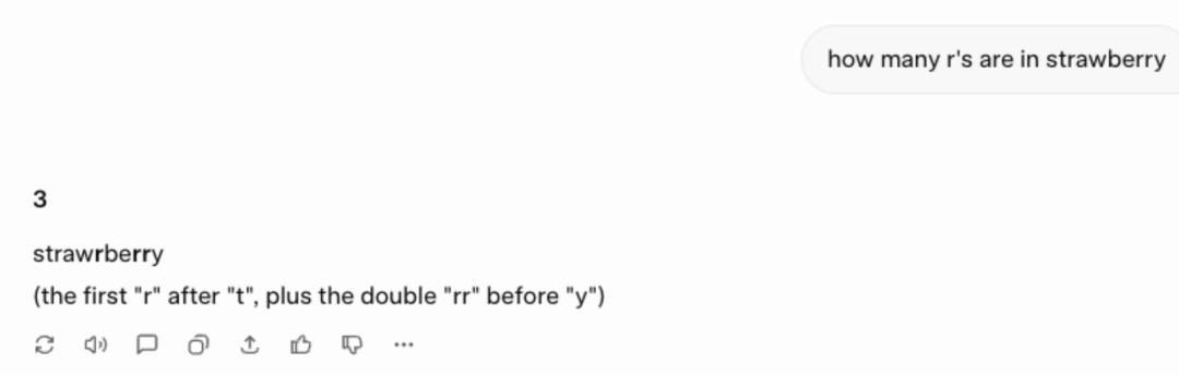 第一个问题是“strawberry中有几个r”,虽然Grok 4.2测试版清楚给出了答案:3个,但在解释时把strawberry拼错了,多加了一个“r”。