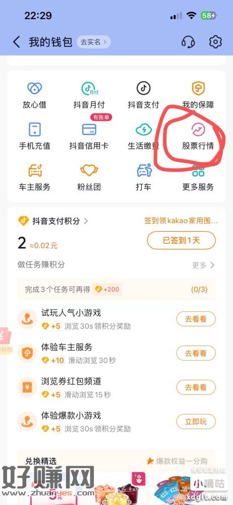 抖音-我的-我的钱包-股票行情提现秒到银行卡,不用开户