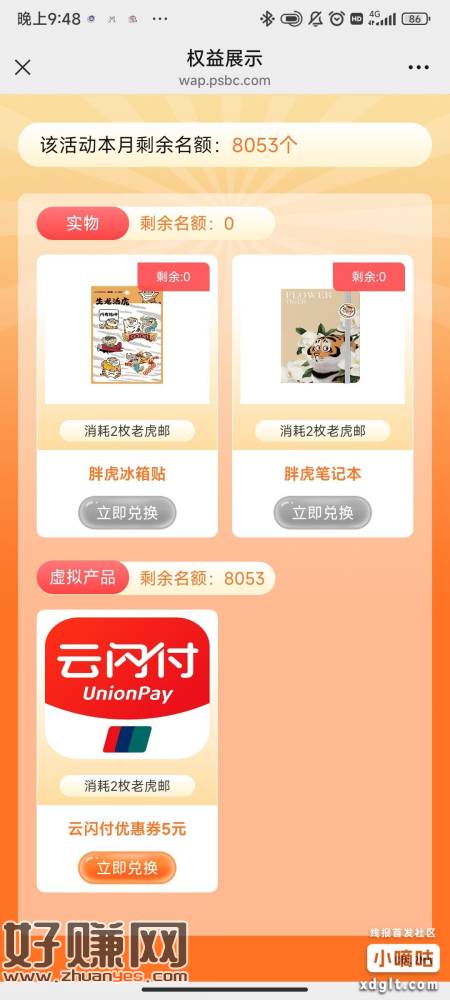 之前玩过邮储胖虎卡公众号的 可以去免费拿个抱枕 我的已经到了 应该送的有2个老虎邮 可以换5r云闪付立减