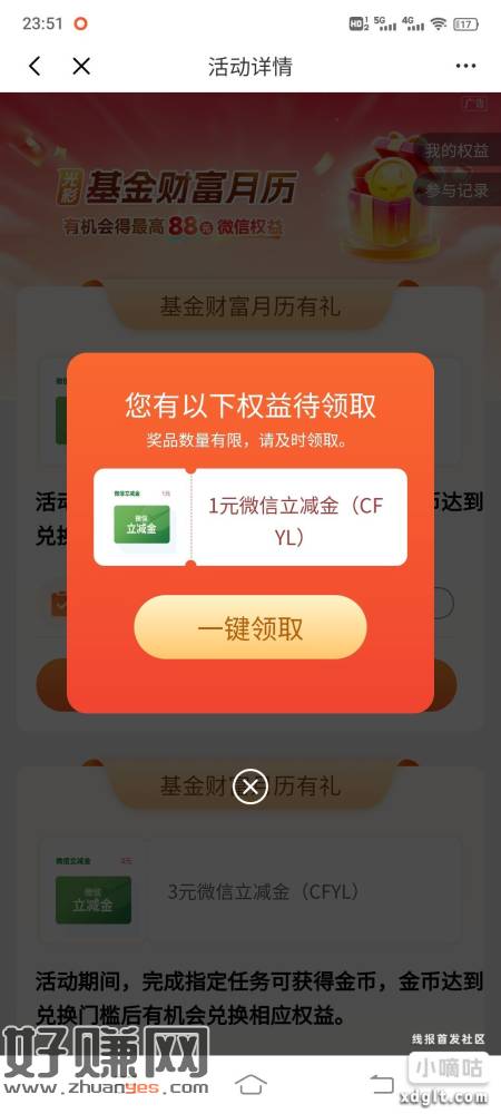 光大银行APP,我的—权益—我的活动—更多—私人银行专区,2月基金财富月历活动我点进去给了1立减金,不知道是什么活动规则,自测