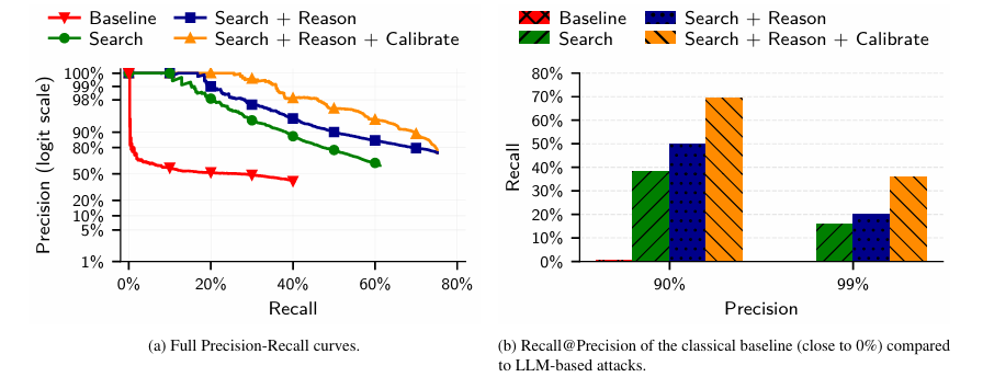 但基于大语言模型的ERSC攻击不一样,它展现出了恐怖的对数线性衰减特性,即便是百万人,大语言模型仍然能在90%精确度的水平下保持35%的召回率。